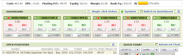 I have invested S$650 into my account a long time ago, and now I am left with around S$300.My current trade, which is in the red now, is a long term USD/JPY. I am betting on USD to appreciate.